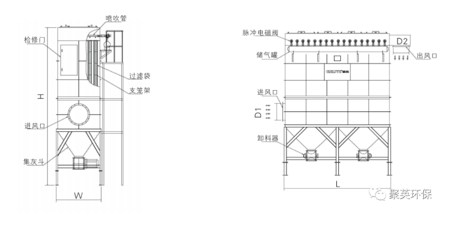 含塵氣體進(jìn)入脈沖袋式除塵器,氣流流經(jīng)灰斗,流速放慢,慣性作用使粗顆粒粉塵直接落入灰斗。起預(yù)收塵的作用,氣流隨后通過內(nèi)部裝有金屬骨架的濾袋,粉塵被捕集在濾袋表面,凈化后氣體匯集到出風(fēng)口排出,除塵器運行過程中,積附在濾袋上的粉塵越來越多,濾袋阻力增加,處理風(fēng)量逐漸減少,為正常工作,需對濾袋進(jìn)行清灰,由脈沖控制程序控制脈沖閥開啟,壓縮空氣由噴吹管各孔經(jīng)文氏管噴射到濾袋內(nèi),濾袋瞬間急劇膨脹,使積附在濾袋表面的粉塵脫落。清下粉塵落入灰斗,經(jīng)排灰系統(tǒng)排出機(jī)體。由此使積附在濾袋上的粉塵周期地脈沖噴吹清灰,使脈沖布袋除塵器始終保持高效運行狀態(tài)。