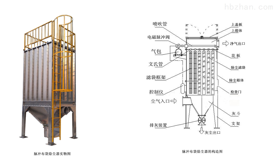 布袋式除塵器屬于環(huán)保設(shè)備的一種,作用是大氣污染治理,過(guò)濾粉塵廢氣。主要由上箱體(凈氣室)、中箱體(塵氣室)、灰斗、脈沖清灰系統(tǒng)、濾袋、濾袋骨架、進(jìn)出風(fēng)口、壓差計(jì)、檢修人孔、卸灰裝置、和pLc控制儀等組成。